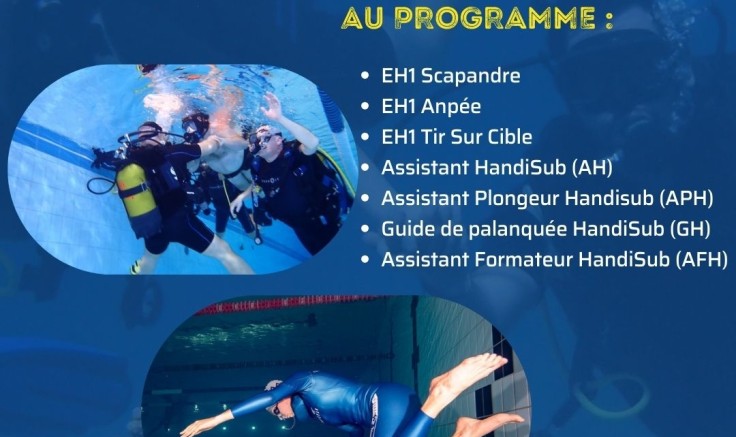 Il sera ouvert aussi aux Guide de palanquée pour la qualification Guide de palanquée handisub ( GH ) , aux PA12 et N2 pour la qualification aide plongeur Handisub (APH ) aux licencies pour la qualification aidant Handisub ( AH ) et aux pratiquant en situation de Handicap PESH 20m pour la qualification aidant formateur Handisub (AFH )