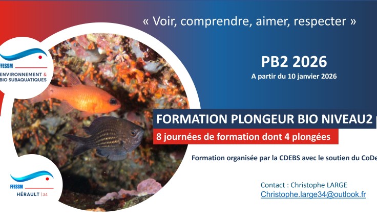 La commission Environnement et Biologie de l'Hérault lance une nouvelle formation Plongeur Biologie Niv2 (PB2) à partir de janvier 2026.