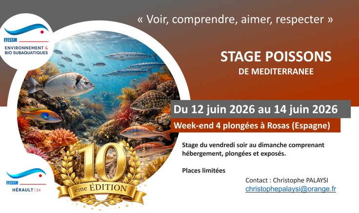 Alors n'attendez pas et inscrivez vous en utilisant la plateforme HelloAsso en suivant le lien Stage poissons de Méditerranée 2026 - Fête sa 10ème édition https://www.helloasso.com/associations/ffessm-34/adhesions/stage-poissons-de-mediterranee-2026-fete-sa-10eme-edition.